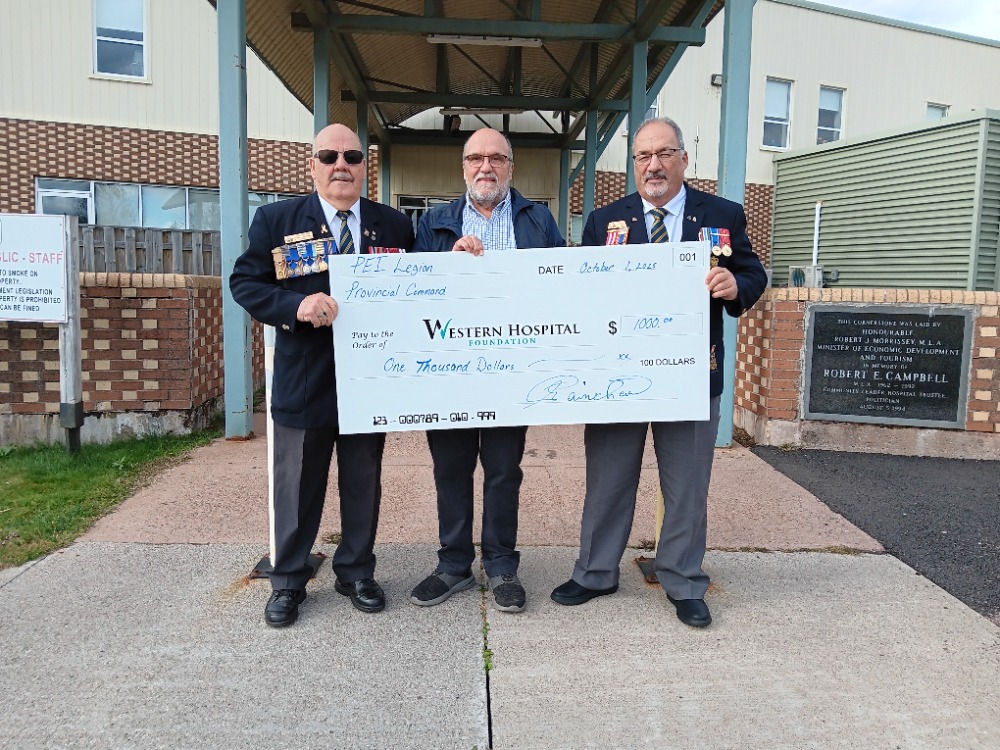 Gilles Painchaud, Finance Chair representing PEI Command - RCL along with 1st Vice President Mario Couture presenting a check to Dave Pizio, Chairman of the Westeran Hospital Foundation.. Thank you for the work you do within out Community.